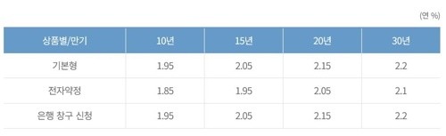 금리는 대출 기간(10년·15년·20년·30년)이나 신청 방법에 따라 다르다. 10년 만기 대출의 경우 기본 1.95%인데, 온라인으로 전자 약정하면 0.1%포인트 추가 금리 혜택을 받아 연 1.85%를 적용받을 수 있다.