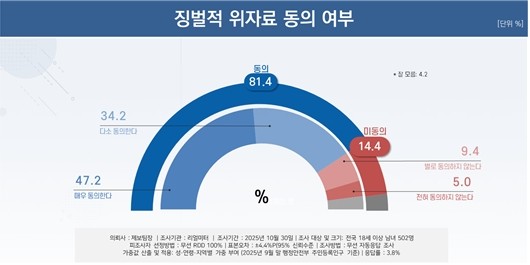 위자료란 이혼이나 혼인관계 파탄으로 인해 배우자가 입은 정신적·심리적 손해에 대해 지급되는 금전적 배상의 개념이다. 현재 한국 민법상 이혼 시 배우자 간 책임이 인정될 경우 위자료 지급이 가능하나 징벌적 위자료는 유책배우자에게 징벌적 성격을 갖는 고액 위자료 지급을 허용한다는 제도를 의미한다. 이번에 공개된 조사에서 81.4%가 동의한 것은 이혼 책임이 있는 배우자를 보다 엄격하게 책임지게 하자는 공감대가 형성되고 있음을 보여준다.