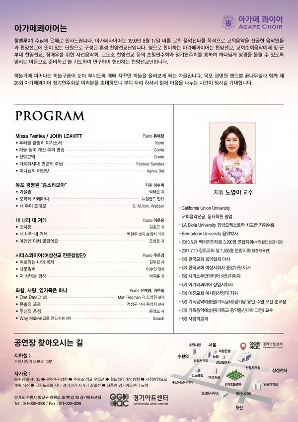 아가페콰이어(지휘 노영아 교수)가 오는 10월 21일(화) 오후 7시 30분, 경기아트센터 대공연장(수원)에서 제26회 정기연주회 “천사들의 합창”을 개최한다. 이번 연주회는 목포광명원 핸드벨팀 ‘꿈나무들’이 함께하며, 가을밤을 아름답게 수놓을 천상의 하모니를 선사할 예정이다.