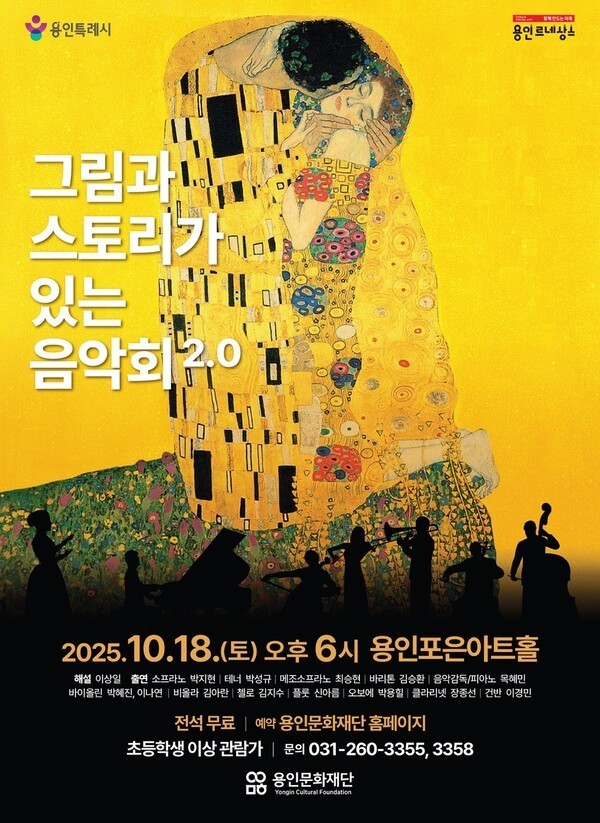 용인특례시(시장 이상일)는 오는 2025년 10월 18일(토) 오후 6시, 용인포은아트홀에서 시민들을 위한 특별한 문화공연 **‘그림과 스토리가 있는 음악회 2.0’**을 개최한다. 이번 공연은 용인문화재단이 주최하며, 예술과 음악, 그리고 감동적인 이야기로 가득한 무대를 통해 시민들에게 깊은 울림을 선사할 예정이다.‘그림과 스토리가 있는 음악회 2.0’은...