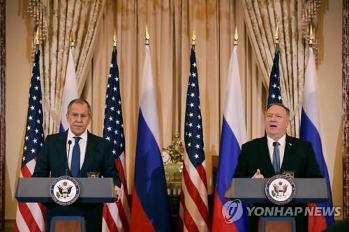 기자회견하는 폼페이오 미 국무장관(오른쪽)과 라브로프 러시아 외무장관
