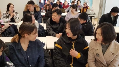 북한 학생들은 5일 베를린자유대 한국학연구소를 찾아 박노자 오슬로대 교수의 특강에 참석한 베를린자유대 학생들과 인사를 나눴다.