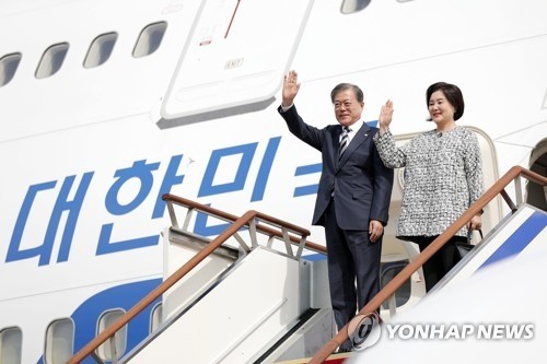 문재인 대통령과 김정숙 여사가 26일 오후 서울공항에 도착한 공군1호기에서 손을 흔들고 있다.