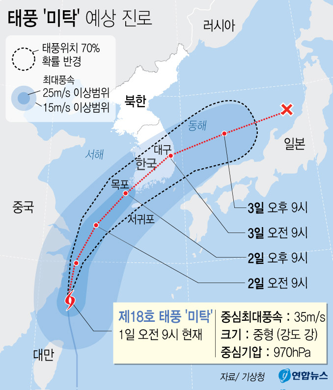 기상청은 태풍의 직·간접 영향으로 강한 비바람이 예상되니 저지대 침수와 하천범람, 시설물 파손 등 피해가 없도록 각별히 유의해야 한다고 당부했다.