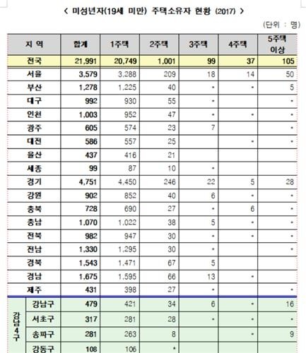 지역별로 보면 경기도의 미성년자 주택 소유자가 4천751명으로 가장 많았고, 서울 3천579명, 경남 1천675명, 경북 1천543명, 전남 1천330명, 부산 1천278명, 충남 1천70명, 인천 1천3명 순이었다.