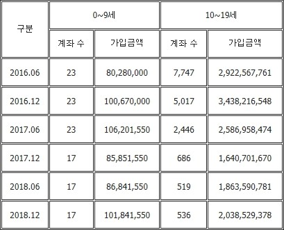 10세 미만 어린이들이 약 5억6천만원을, 10∼19세가 약 144억9천만원을 ISA 계좌에 넣었다.