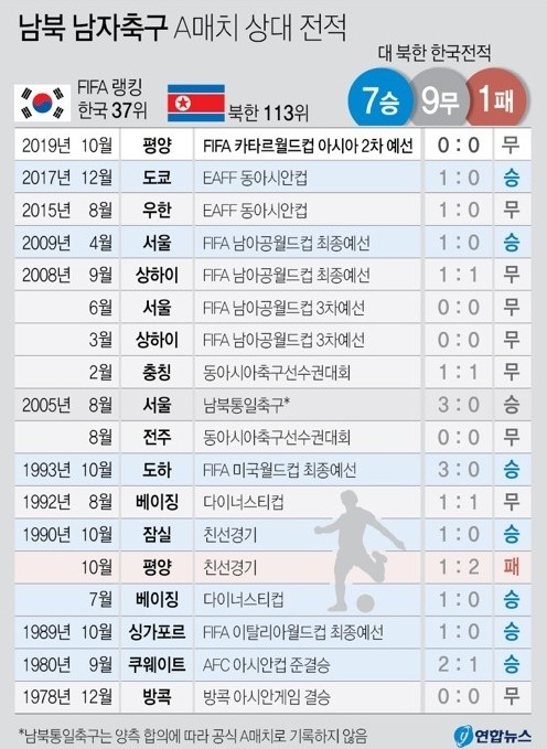 이날 무승부로 한국은 북한과 역대 전적에서 7승9무1패를 기록했다. 더불어 북한과는 12경기 연속 무패(4승8무)를 이어갔다.