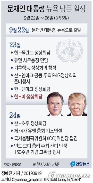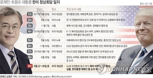 도널드 트럼프 미국 대통령이 오는 23일(현지시간) 유엔총회가 열리는 미국 뉴욕에서 문재인 대통령과 북한 비핵화 해법 등을 놓고 머리를 맞댄다.