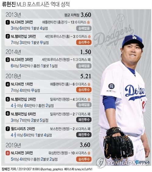 류현진은 2013년 세인트루이스 카디널스를 상대로 한 NLCS 3차전(7이닝 무실점), 작년 애틀랜타 브레이브스와 벌인 NLDS 1차전(7이닝 무실점)에서 각각 승리를 안았다.