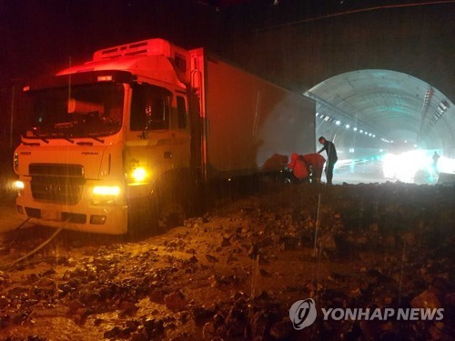 3일 새벽 제18호 태풍 '미탁'으로 400㎜가 넘는 폭우가 쏟아진 강원 삼척시 근덕면 장호터널 인근에서 토사 유출로 인해 대형 트럭이 고립돼 소방대원들이 펌프차를 이용해 트럭을 흙더미에서 빼내는 작업을 하고 있다. |