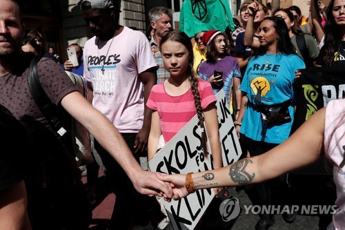 지난 20일(현지시간) 미국 뉴욕에서 열린 기후변화 대응촉구 시위에 참여한 스웨덴 청소년 환경운동가 그레타 툰베리(가운데)