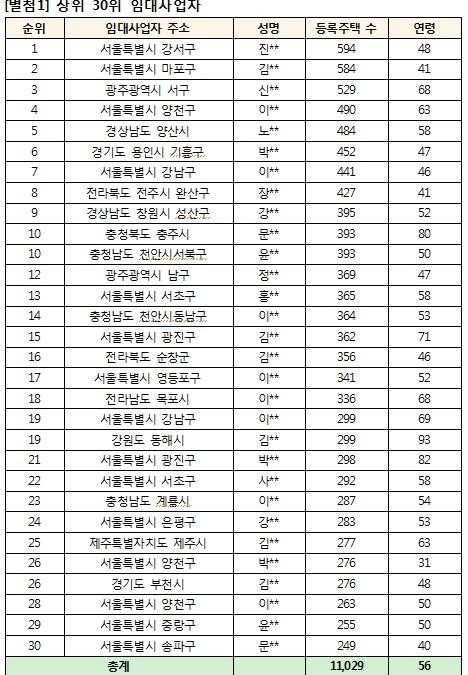 전국 임대주택 시장에서 가장 '큰 손'은 서울 강서구의 40대 주민으로, 무려 약 600채에 이르는 임대주택을 보유한 것으로 나타났다. 이 사업자를 포함해 임대주택 수 상위 30명이 보유한 주택만 1만1천여채에 이르렀다.