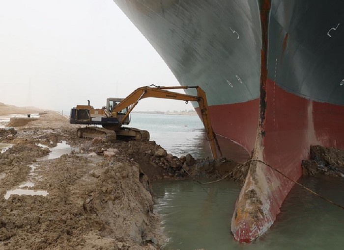 ▲ 이집트 수에즈 운하를 가로막고 선 에버기븐호 앞의 굴착기/ 사진= 수에즈운하관리청(SCA) 제공 |