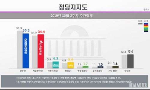 14일 리얼미터 발표에 따르면 YTN의 의뢰로 지난 7∼8일과 10∼11일 전국 19세 이상 성인 2502명을 대상으로 여론조사(95% 신뢰수준에 표본오차 ±2.0%포인트)한 결과 민주당 지지율은 3.0%포인트 하락한 35.3%로 집계됐다. 민주당 지지율은 2주 연속 하락해 지난 3월 2주차(36.6%) 이후 7개월 만에 최저치를 나타냈다. 한국당은 1.2%포인트 상승한 34.4% 지지율을 기록, 2주째 올랐다.