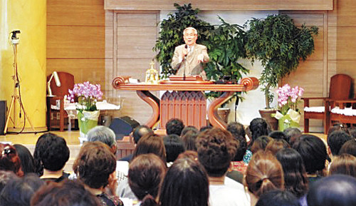 ▲ 장현서 대원수지산업 회장이 전남순천 주성교회에서 간증집회를 인도하고 있다. (기독문화선교회 제공) |