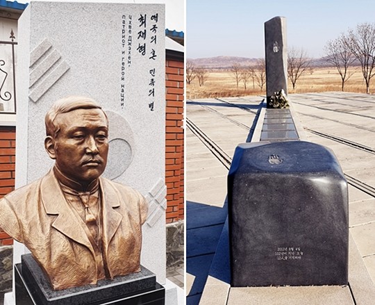 왼쪽 사진은 지난달 기념관에 설치된 흉상과 기념비. 오른쪽은 크라스키노에 세워진 단지동맹 조형물/국민