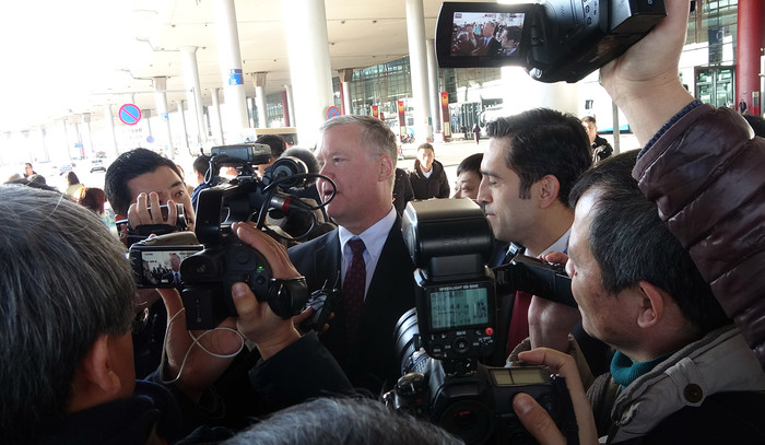 ▲ 스티븐 비건 미 국무부 대북 특별대표 겸 부장관 지명자가 19일 오후 방일 일정을 마친 뒤 중국 베이징 공항에 도착했다. 사진은 취재진에 둘러싸인 비건 대표. 연합뉴스 제공