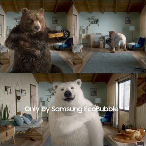곰이 얼룩과 부스러기가 묻은 털옷을 벗어 삼성 세탁기로 직접 빨래를 하고, 새하얀 북극곰으로 변신하는 내용이 담겼다.