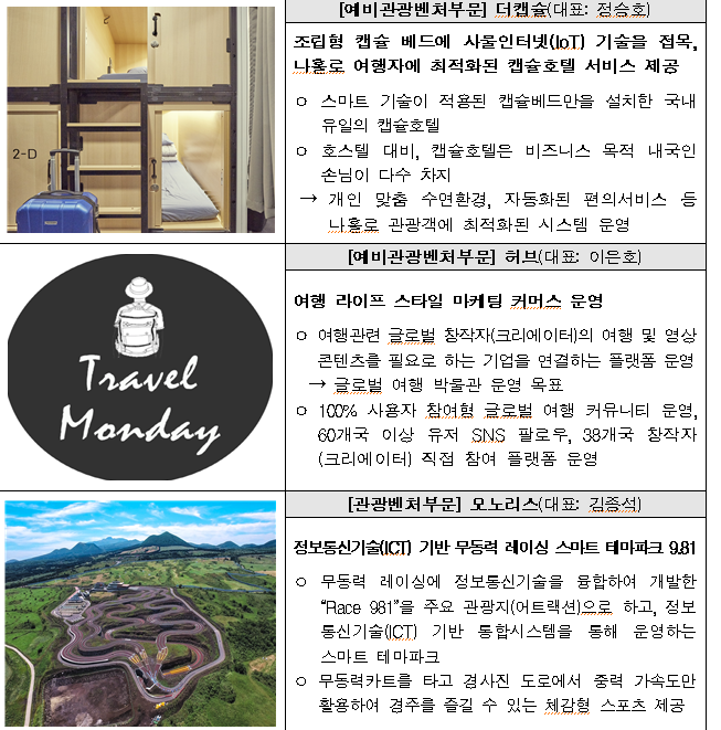 구체적 사업 내용을 보면 ▲예비관광벤처에는 ‘사물인터넷(IoT) 스마트 시스템을 적용한 개인 맞춤형 캡슐호텔’, ‘창작자(크리에이터) 활용 여행 영상 유통 플랫폼’, 등이, ▲관광벤처에는 ‘정보통신기술(ICT) 기반 무동력 레이싱 테마파크’, ‘창의적인 야간 관광체험 제공’ 사업 등이, ▲재도전벤처에는 ‘지도와 영상 콘텐츠 활용 관광 웹페이지 제작 플랫폼’, ‘무슬림 관광객을 위한 할랄 한식’ 사업 등이 포함됐다.