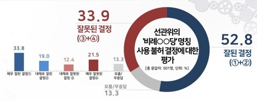 선관위 '비례○○당' 명칭 불허…찬성 52.8%, 반대 33.9%