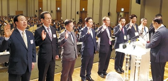 강원도 평창 한화리조트에서 2일 열린 대한예수교장로회 백석 제42회 총회에서 신임 임원이 선서를 하고 있다. 왼쪽부터 장종현 총회장, 류춘배 목사제1부총회장, 정영근 목사제2부총회장, 안문기 장로부총회장, 김진범 서기, 이태윤 부서기, 김만열 부회록서기, 정규성 회계.