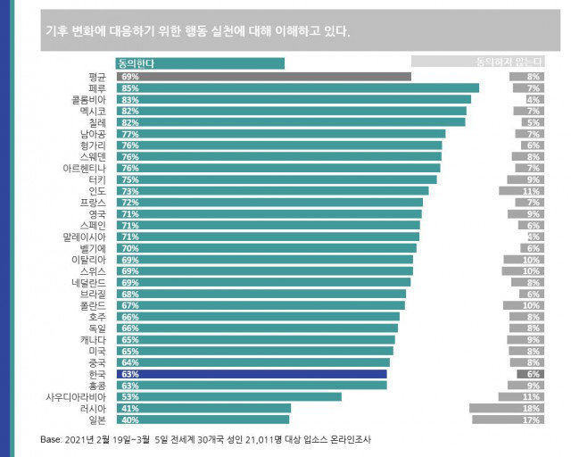 조사에 따르면 세계인 10명 가운데 7명(69%)은 환경, 기후 변화에 대응하기 위해 어떤 행동을 실천해야 하는지 이해하고 있다.