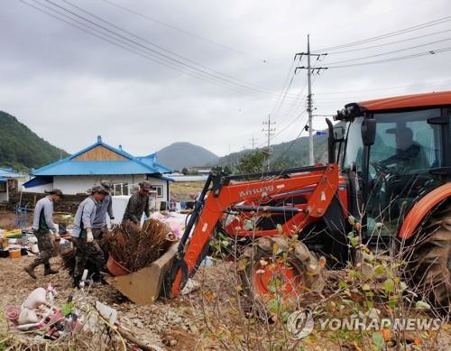 육군 50사단 장병들이 4일 경북 울진군 매화면 금매2리 일대에서 태풍피해 복구를 하고 있다.