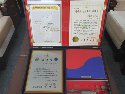 ▲고(故) 김기봉 이등중사 신원확인 통지서 및 호국의 얼 함 |