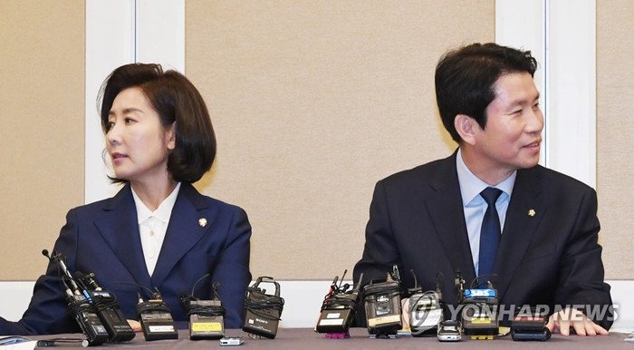 더불어민주당 이인영 원내대표(오른쪽)와 자유한국당 나경원 원내대표가 16일 오후 국회에서 열린 공수처 설치법을 비롯한 검찰 개혁안 등을 논의하기 위한 '2+2+2' 회동에서 시선을 외면하고 있다.