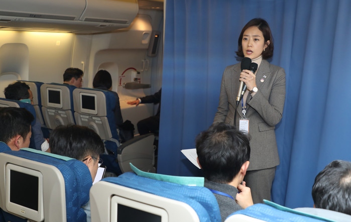 ▲ 고민정 청와대 대변인이 12월 23일 쓰촨성 청두행 공군1호기에서 한중 정상회담 관련 브리핑을 하고 있다. 연합뉴스 제공