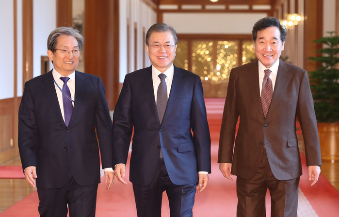 ▲문 대통령, 국무회의장으로 문재인 대통령이 3일 오전 청와대에서 열린 국무회의에 이낙연 국무총리(오른쪽), 노영민 비서실장과 함께 입장하고 있다. 연합뉴스 제공 |