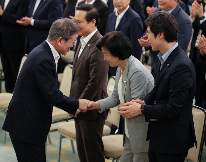 ▲ 문재인 대통령이 1일 오전 청와대 영빈관에서 열린 당·정·청 전원회의에 입장하다 더불어민주당 추미애 전 대표와 인사하고 있다. [연합뉴스 제공] |