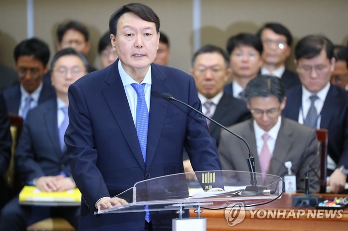 윤석열 검찰총장이 17일 서울 서초구 대검찰청에서 열린 국회 법제사법위원회의 대검찰청에 대한 국정감사에서 업무보고를 하고 있다.