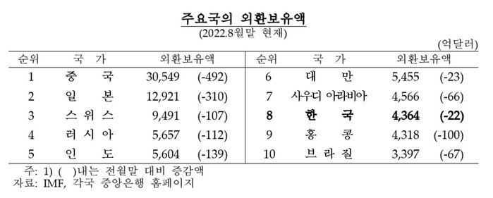 한국의 외환보유액 규모는 8월 말 기준(4천364억달러)으로 세계 8위 수준이다.