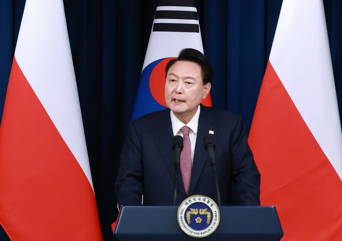 ▲ 윤석열 대통령이 24일 서울 용산 대통령실에서 안제이 두다 폴란드 대통령과 한·폴란드 공동언론발표에서 취재진의 질문에 답하고 있다. 2024.10.24 연합뉴스 제공