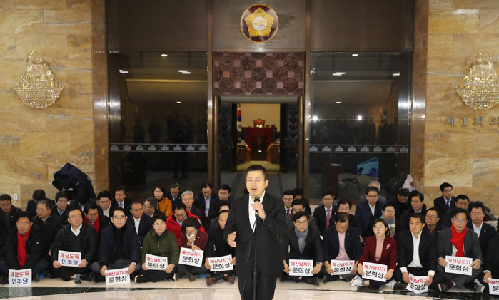 한국당은 4+1 예산안 처리에 강력 반발하며 전날 밤 12시께 산회한 본회의 이후 국회 본회의장에서 농성을 이어가고 있다. 황교안 대표는 "좌파독재 완성을 위한 의회 쿠데타가 임박했다"며 "대한민국을 무너뜨릴 좌파독재를 반드시 막아내야 한다. 결사항전의 각오로 맞서 싸워나가겠다"고 밝혔다.