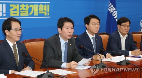 ▲ 더불어민주당 이인영 원내대표가 8일국회에서 원내대책회의를 갖고 여상규 법사위원에 대한 국회 윤리위 제소에 대한 모두 발언을 하고있다. |