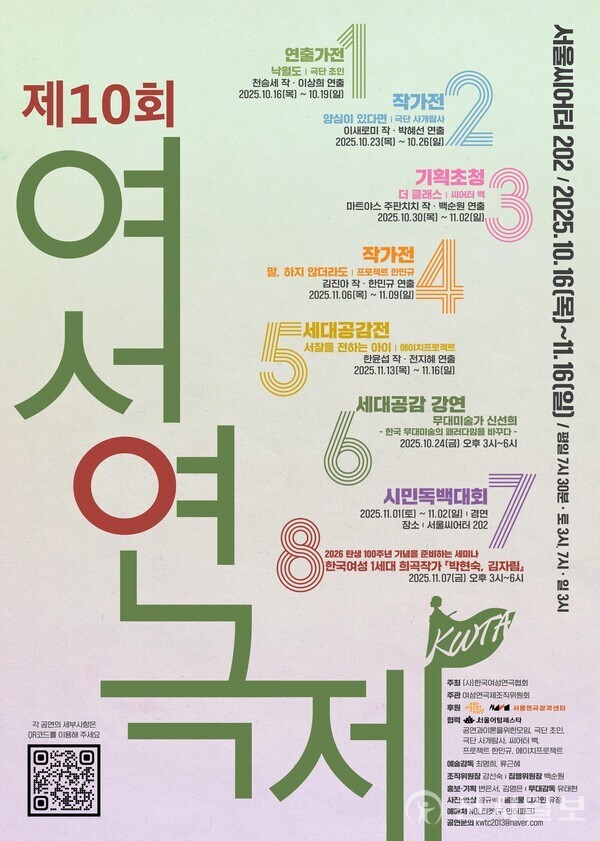 올해 여성연극제는 10월 16일부터 11월 16일까지 서울연극창작센터와 서울씨어터 202에서 진행된다. 주요 프로그램으로는 연출가전 ‘낙월도’, 작가전 ‘양심이 있다면’·’말, 하지 않더라도’, 세대공감전 ‘서찰을 전하는 아이’, 기획초청작 ‘더 클래스’ 등이 무대에 오른다. 또 무대미술가 신선희 선생의 강연과 제1세대 여성 희곡작가 박현숙·김자림 탄생 100주년 기념 세미나가 부대행사로 마련됐다. 시민 참여형 ‘시민독백대회’도 함께 진행돼 관객이 직접 무대에 오르는 체험 기회를 제공한다.