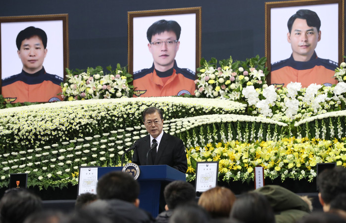 문재인 대통령이 지난 10월 31일 독도 해역 헬기 추락사고로 순직한 소방항공대원 5명의 합동영결식에서 고인들의 넋을 기렸다.
