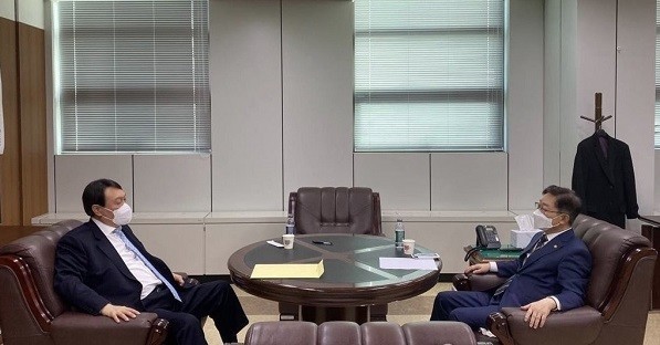 ▲ 서울 서초동 서울고검 청사에서 박범계 법무부 장관(오른쪽)과 윤석열 검찰총장이 의견을 나누고 있다/ 사진= 연합뉴스 제공.
