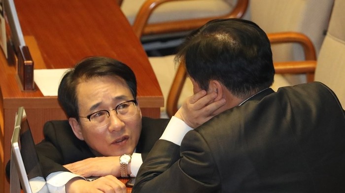 ▲ 더불어민주당 이원욱 원내수석부대표(왼쪽)와 자유한국당 이진복 의원이 24일 오후 국회 본회의장에서 이야기를 나누고 있다. 연합뉴스 제공 |