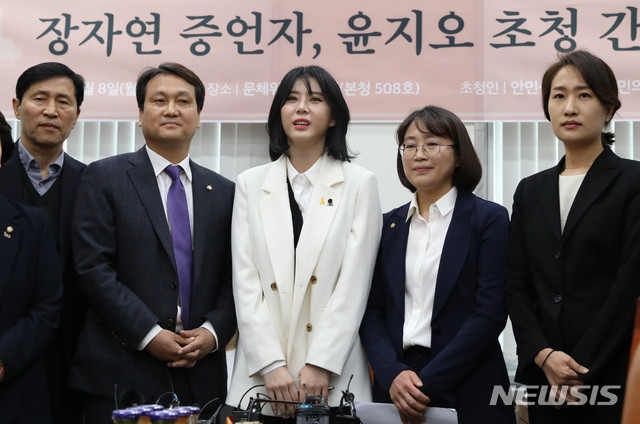 '장자연 증언자' 윤지오 씨가 4월 8일 서울 여의도 국회 문화체육관광위원회 소회의실에서 열린 간담회에서 카메라 앞에 선 뒤 발언하고 있다.