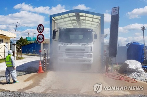 거점소독시설에서 통행 차량을 소독하고 있다/연합