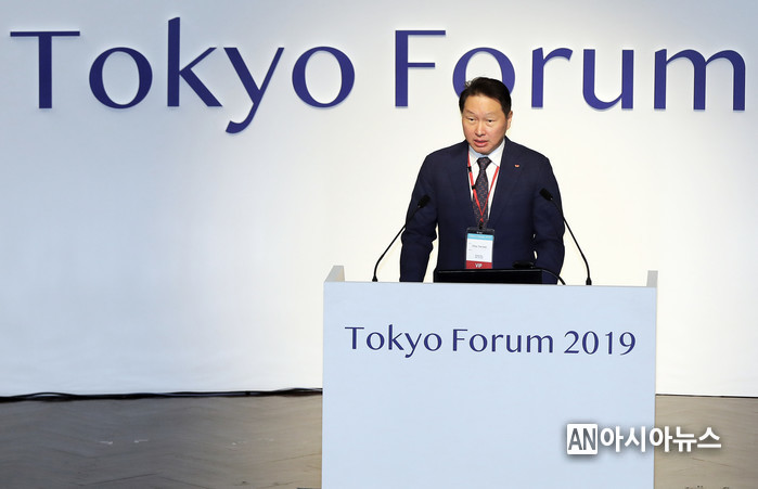 ▲ 최태원 SK그룹 회장이 6일(현지시간) 도쿄대 혼고캠퍼스에서 '미래를 만들어나가자(Shaping the Future)'는 주제로 SK그룹 최종현학술원과 도쿄대가 공동 개최한 국제학술대회 '제1회 도쿄포럼'에서 연설을 하고 있다. SK그룹 제공