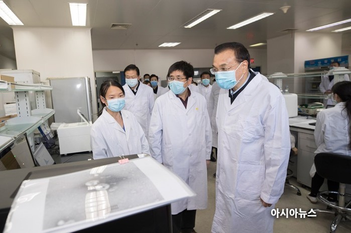 ▲ 신종 코로나바이러스 감염증에 대한 중앙 실무 그룹 지도자인 리커창 중국 국무원 총리가 30일 전염병 예방 및 통제에 대한 과학적 연구 상황을 조사하기 위해 현지 질병 통제 및 검사센터를 방문해 전문가 의견을 경청하고 있다. 중국 국무원 제공