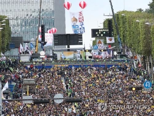 5일 오후 서울 서초구 누에다리 인근에 설치된 경찰 펜스를 사이에 두고 '제8차 검찰 개혁 촛불 문화제'(아래)와 '문재인 퇴진, 조국 구속 요구집회'가 동시에 열리고 있다. |