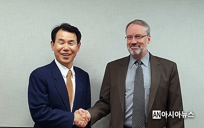 ▲ 정은보 방위비분담협상 대사와 제임스 드하트 미국 국무부 선임보좌관이 2019년 12월 3~4일 미국 워싱턴DC에서 열린 제11차 한미 방위비분담특별협정 체결을 위한 회의에 참석해 악수하고 있다. 외교부 제공