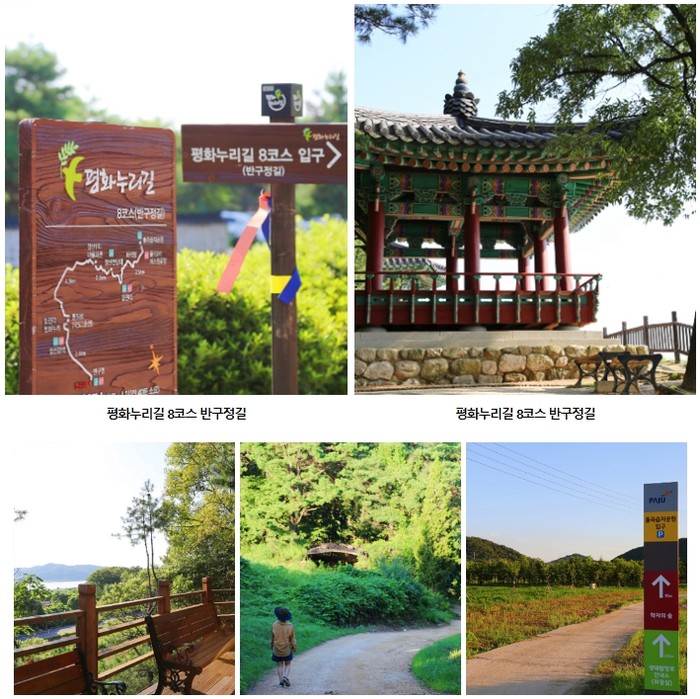 -코스경로 : 산덕마을 입구→명옥헌원림→봉황노인정→수남학구당→광주호→식영정→가사문학관→환벽당→광주호 호수생태원→소쇄원-거리 : 7.7km-소요시간 : 2시간 30분-난이도 : 보통-자세히 보기 : http://www.durunubi.kr※ 해당 정보는‘죽녹원~면앙정~송강정~소쇄원~도수정원림’을 경로로 하는 전체 32km에서 일부 구간인 7.7km에 대한 정보입니다.5. (경기 파주) 평화누리길 8코스 반구정길평화누리길 8코스 반구정길은 조선 시대를 대표하는 두 학자의 마음을 헤아릴 수 있는 길이다. 방촌 황희 선생이 여생을 보냈다는, 갈매기와 벗 삼았던 정자 반구정(伴鷗亭)에서 바라본 풍경은 평화롭다. 다정한 시골길을 지나 장산전망대에 오르면 탁 트인 북녘의 풍경과 마주한다. 율곡 이이 선생이 제자들과 시를 지었다는 화석정(花石亭)에선 왕을 향한 일화가 전해져오는데 이곳 역시 유유한 임진강을 바라볼 수 있는 뷰포인트다. 율곡습지공원에 이르면 계절을 온전히 느낄 수 있는 식물 사이로 천천히 산책하기 좋다.
