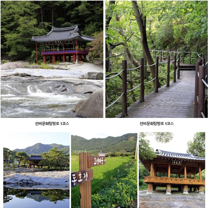 -코스경로 : 용문면 하금곡 버스정류장~병암정~용문면사무소~금당실 마을~금곡서원~금당실 송림~예천 권씨 초간종택~초간정~용문면 원류(초간정) 버스정류장-거리 : 8km-소요시간 : 2시간 30분-난이도 : 쉬움-자세히 보기 : http://www.durunubi.kr3. (경남 함양) 선비문화탐방로 1코스함양 남덕유산 자락의 화림동 계곡은 함양 8경 중 하나다. 선비문화탐방로 1코스는 화림동 계곡의 수려한 경관을 따라 6km 이어져 있다. 옛 선비들이 정자를 짓고 자연을 벗 삼아 풍류를 읊던 길을 따라가 보는 코스다. 예부터 ‘팔담팔정(8개의 못과 8개 정자)’으로 이름났던 화림동 계곡에는 현재 거연정, 군자정, 동호정, 농월정 등 7개의 정자가 남아 있다. 산책로가 잘 조성되어 있고 너럭바위와 정자가 많아 쉬엄쉬엄 걷기 좋다.
