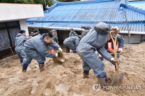 ▲ 구슬땀 흘리는 군 장병들 7일 강원 삼척시 근덕면 초곡마을에서 군 장병들이 태풍 피해 복구작업을 하고 있다. |